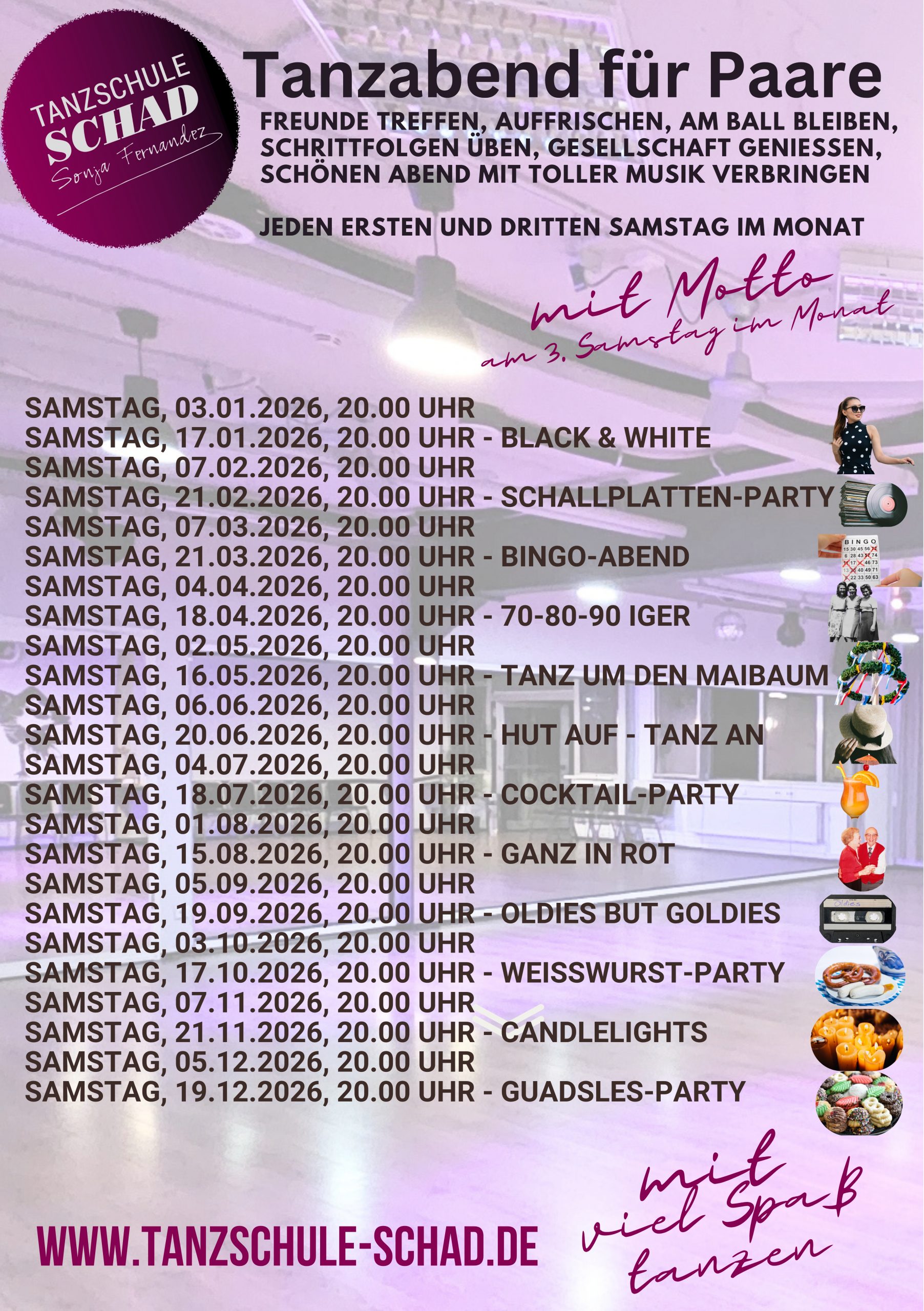 Die Tanzabende finden jeweils am ersten Samstag und dritten Samstag des Monats zu unten genannten Terminen  von 20.00 bis 23.00 Uhr statt.